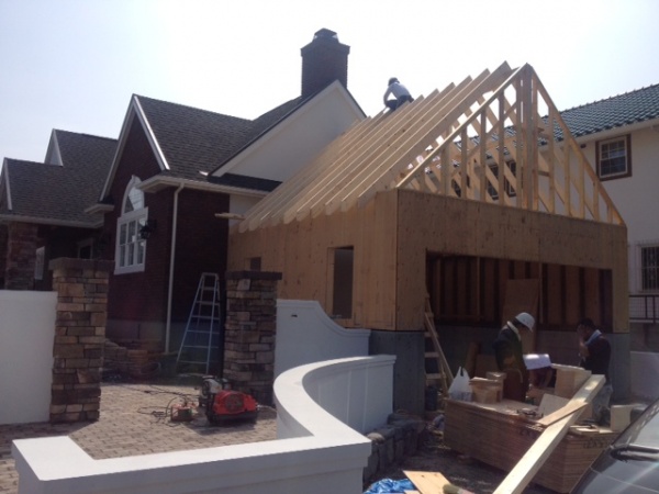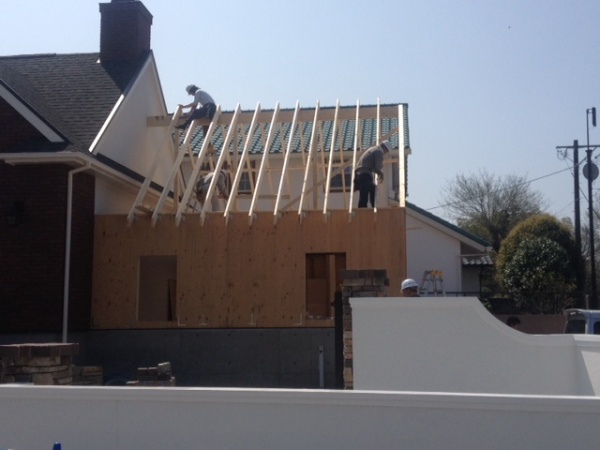 雨の予報の合間を縫って今日熊本M邸の車庫の屋根組です。足場も昼からくみました。之ができて、全体のファサードが完成です。バランスがぐっと良くなりました。月曜日に、窓取り付けを行います。屋根、シャッター、下地ボード、塗り壁、フェルト、化粧取り付け・・・・細かい段取りが大変です。この建物の完成系は、とても優れた住宅として、内外とも、万人に、評価されるはずです。重厚さと、おしゃれさを兼ね備え、品のある家になりました。この作品ほど、照明、カーテン家具、小物に至るまでオーナーとお互い信頼しあい、プラス思考で建てた家はないかもしれません。オーナーに感謝します。圧巻の家になるはずです。