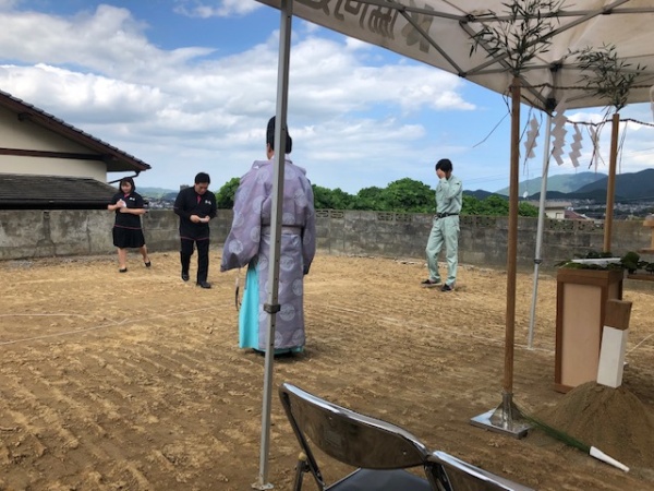 宗像T邸の解体を終え地鎮祭を行いました。真夏のような暑く、いい天気です。皆さん縄張りを見て小さいと不安がられますが、T後夫妻も「こんなちいさいのですか?」と不安いっぱいです。神事は宮地嶽神社からきていただき、厳かに終わりました。協同建設さんがいつものように、しっかり段取りいただき、テントも張ってくれたので、暑さがしのげ、いい地鎮祭でした。工務店としてやるべきことを前向きにやってくださることに感謝します。20年近く前に建てさせていただいた作品を見ましたがきちんと手入れいただき、素敵です。