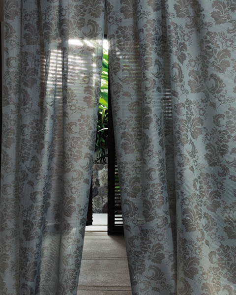 室内からはほどよく外の景色は見えて、でも外部からはみえずらい柄入のレースです。横にベージュのラインが入っています。写真はトルコブルー系の色ですが、今回はベージュを使いました。昼間は柄はあまり見えませんが夜は柄が浮き出てきます。上品なインテリアに似合う素敵な空間になりました。