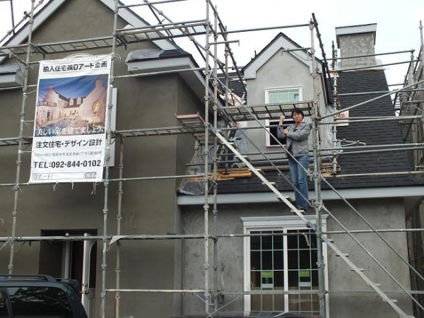 小月は外壁の塗り壁施工中です。中は塗装、造作家具、浴槽据付など職人が入り乱れてます。明日からは、タイル職人のオーナーのお父さんが外壁の一部に石を張られる予定です。キッチンの床、バスルームのタイルもお願いしています。今までの出来栄えについては、オーナーも大変喜んでいただいており、気を抜かず仕上げたいと考えてます。