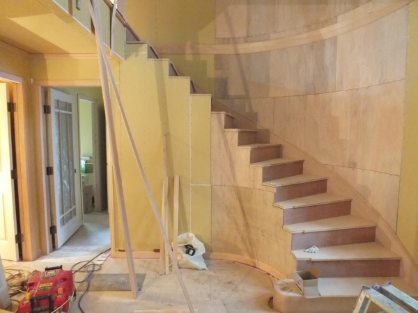 小月S邸の螺旋階段の形が出来つつあります。壁のアールにそってササラもとり付き、段板も組みあがり、いい感じです。手摺をつけ、塗装するとまさに今回のインテリアの主役にふさわしい存在感だと思われます。来週は外の石張り、塗装工事、キャビネット組等まさに「化粧」の工事です。20日からクロス工事を予定しています。