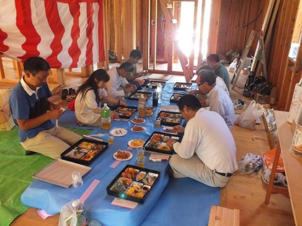 小月S邸がサッシまで入れての上棟式となりました。天気も良く最高です。屋根を葺き、窓が入ると家の表情がしまります。オーナーご夫婦とF大工で家の四隅をお払いしてから、みんなで豪華なお弁当をいただきました。木に囲まれて、談笑しながらの祝席はとても楽しいものです。もちろんお酒は飲めませんが,こんな席を設けていただくことで、現場の一体感がうまれ、打ち合わせや、連絡が密になり気持ちよく仕事ができるようです。家づくりは「アナログ」でなくてはなりません。みんなの提案、アイデアを取り入れながらいい家に作り上げたいものです。