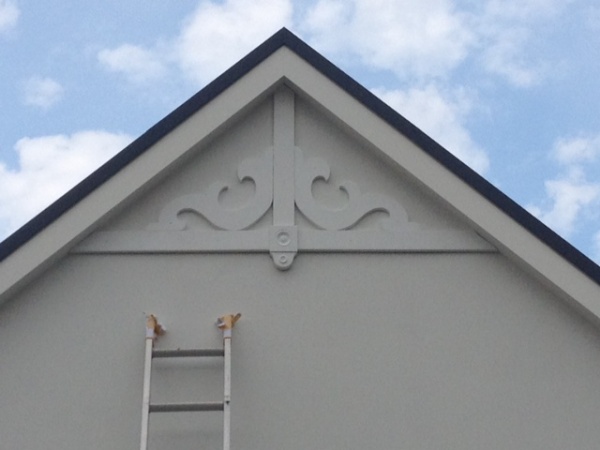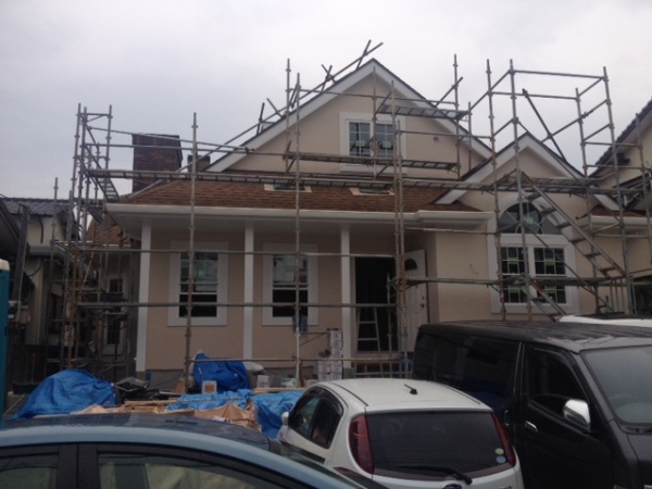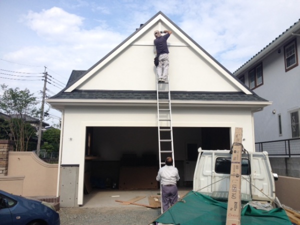 西区D邸はもうすぐ足場が取れます。シートは取り外し、全貌が見えやすくなりました。内部は塗装と、モール造作などが行われています。風雨が強くなるというので、昼から熊本に走り、ガレージ妻飾りを取り付けました。下で組んでから二段はしごで取り付けです。足場がないので小さな作業ですが三人で協力してより安全に注意しての作業でした。終了後「なかなかいいなー」と見上げながら笑顔で終了です。仕事の奥様にメールで写真を送ると、「小澤さんすごーい。」と電話をいただき、ご満足頂いてるんだと思う間もなく「飾りはもちろんばっちりやけど、メールで写真が送れるようになってるじゃないですか。」・・・・・・・・うれしいやら情けないやら。いつも気持ちよくやりがいのある対応、,ユーモアあふれる対応をしていただいて、感謝してます。