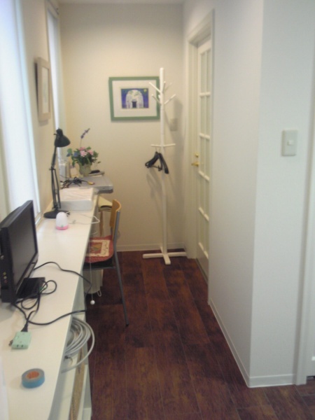 N邸ゲストルームが残工事も含め完成しました。和室から白い洋室に変身です。なぜか心地いい「狭さ」です。カウンターデスク、大きなベット、冷蔵庫付ミニキッチン、クローゼット、小さいテーブルと椅子・・・・・こんな自分の部屋があったらいいと思います。緑豊かな中庭もみえるし、出ることもできます。