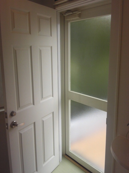 北九州N邸の出入り口を二重ドアにしました。既存のアルミドアを隠すことと、防犯と考えた結果です。なかなか面白いと思います。N邸のリフォームはガラスに塗装したり、間仕切り吊り戸をつくったり、飾り暖炉を作ったり、ガラスフィルムとブラインド、カーテンを使って明かりが漏れないようにしたり、庭に目隠しフェンスを設置したりしました。すべてオーナー夫婦の希望が出させたアイデアです。そういう意味では面白いリフォームの現場でした。