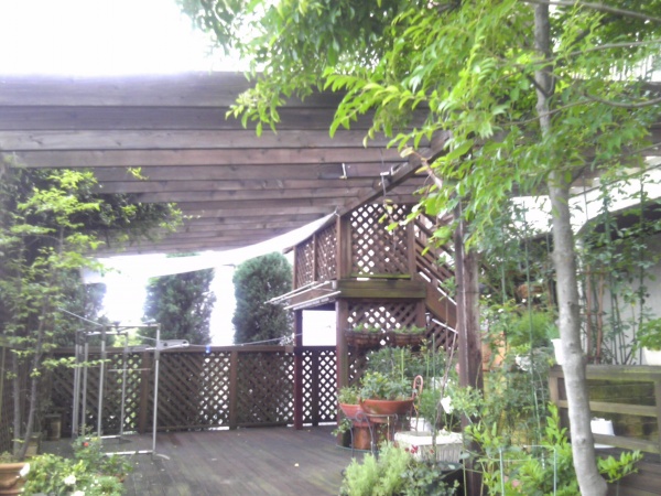 南区K邸には素敵な庭があります。二階のリビングダイニングから広いバルコニーに出て木製外階段を下るとパーゴラ付の大きな木製デッキのまわりに木々が繁り小さな池があります。十年の月日が全てをなじませているように感じます。ただ床にコケができ滑りやすくなっているため、高圧洗浄をして、パーゴラに無色透明のバンポーライトかテントをつけようと考えています。収納も設けてさらにグレードアップした使えるデッキにしようと思います。オーナーのご希望以上のものを提案するつもりです。我々のオーナーは皆さん感性豊かですがK先生の場合感性だけではなく技術者としての視点でも物事を捉えられるのでデザイン、使いやすさ、耐久性、経済性・・・トータルで考え即決されます。いつもプラス思考の楽しい打ち合わせになります。来月半ば完成予定です。