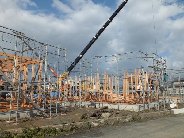 大木町の現場はついにクレーンがはいり、本格的建て方です。もちろん横では基礎コンクリートを打ってます。天気も良く声が飛び交い活気ある現場です。現場の一部に高圧線が走り、クレーン作業の間、九電関係者が二名で見守るそうです。安全のためとはいえ、一日中見守るわけですからある意味大変な仕事です。「人間なれた頃、横着して事故起こすことが多いですよ。」と言ってました。九電も現場の人たちは責任を持って仕事をしていると言うのに・・・・。