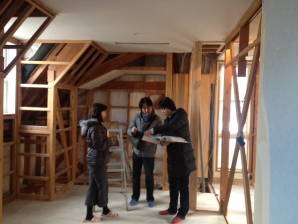東京からIご夫妻にお越しいただき、現場打ち合わせです。事前に打ち合わせポイントを把握いただいていたようで、必要家具の寸法などご用意いただき、短時間で密度の濃い打ち合わせができました。要点をご理解していただけるので助かります。デザインについてはほとんどお任せいただいてるので、よりダイナミックな空間にして喜んでいただこうと考えています。屋根の色、造作、エアコン、ストーブ、吹き抜け・・・・・・・・・わくわくします。