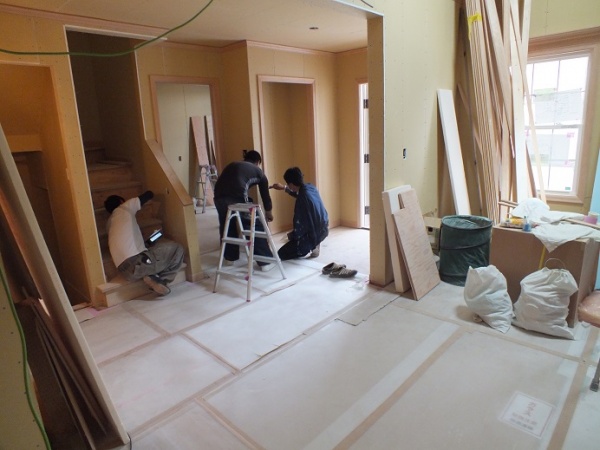 外部の塗り壁は終わりました。いよいよ、内部仕上げです。しごいて、塗装準備です。われわれの家は塗装が重要です。平田が細かく、塗装、クロス、タイル、石、造作家具・・・・・・全ての仕上げを、職人に伝える作業で大変です。発注者、職人、みんなにわかるように、現場にも張ってます。ソフトも、ハードも「手間をかける」家づくりです。先日、横浜の若夫婦にD邸をご案内したところ、「すごく形がよくて素敵ですね。」うれしい言葉をいただきました。この建物は正面メインファサードがアメリカ的ですから根回りの、植栽や、シンボルツリーの大きさ位置、エントランスの形、素材がとても大事です。真正面から美しい家はそうそうありません。楽しみです。