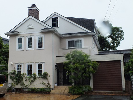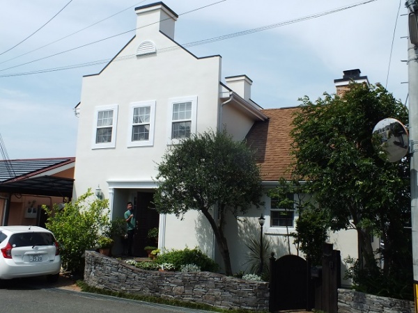 博多区の高台に建つT邸。10年たち、外壁塗り替え、および、サッシ周りコーキングを行いました。予定外で破風の腐食があったところはやり替えました。きれいになり、これで、梅雨の大雨も心配いりません。お茶を入れてくださり、談笑させていただきました。相変わらず、素敵な熟年のお住まいです。戸建の、リフォームもご紹介いただき、お世話になりっぱなしです。笑顔を絶やさず、いいご夫婦関係の方は魅力的です。家族、仕事、仲間これがうまくいってると、幸せの連鎖が起こるようです。このおうちもよくご案内させていただいてます。斜面に建つ38坪の1LDKプラス、サービスエリアは圧巻の空間構成です。魔女の腰掛と、ラウンドサッシ、ブラウンの屋根に、白い外壁はさながらリゾートハウスです。美しい形を構成するプランニングは時に、常識的ではなくなります。それを受け入れて、楽しく住みこなしていただけることに感謝です。