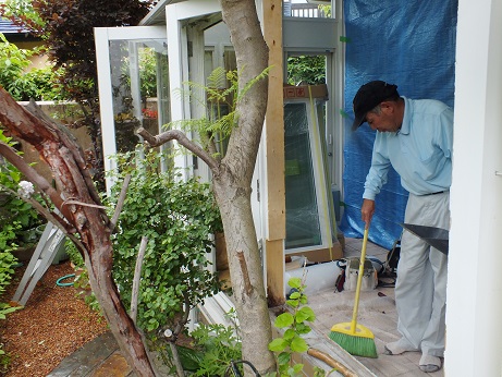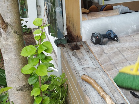 今日から百道浜U邸のサンルーム改修工事です。構造の腐食部分があり、サッシも、アルミから樹脂に変えます。木部も、注入剤に変え、先日、シロアリ対策も施しました。サッシを取り外すと、見立て通りタテ枠とシタ枠の接点が腐食です。ご夫婦ご自慢の庭がより美しく見えて、なおかつ、網戸内蔵の新型樹脂サッシです。今回はスクリーンボックスもつけて、よりおしゃれにデザインしてます。この家はご案内の際、万人に好まれます。それはU夫妻の、トークも含めた楽しい、お人柄もあってのことです。今日も3時のおやつをご主人自らお持ちいただき、恐縮でした。昼から私は熊本S邸に走り、浴室を、UBに変えられる工事の打ち合わせでした。15分ほどで終わり、M邸を覗いてトンボ返りです。博多区の、T邸の外壁も雨との戦いですが、あと一日で終わりそうです。