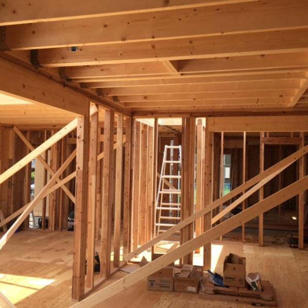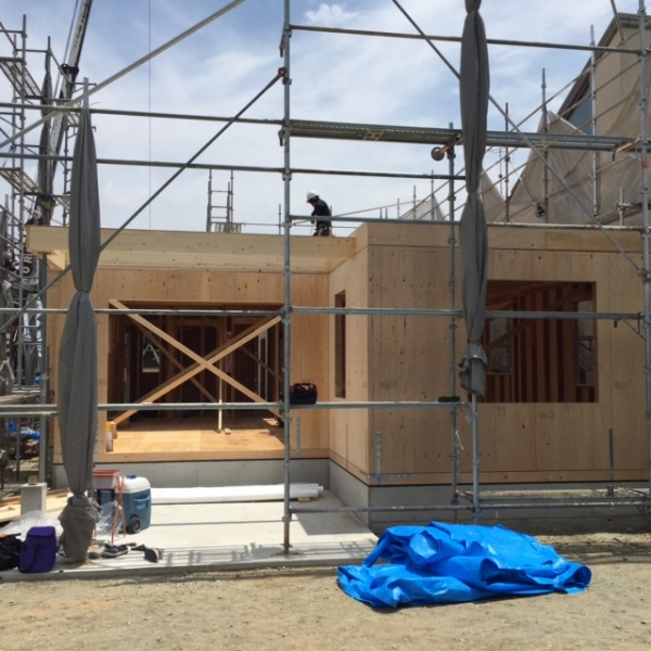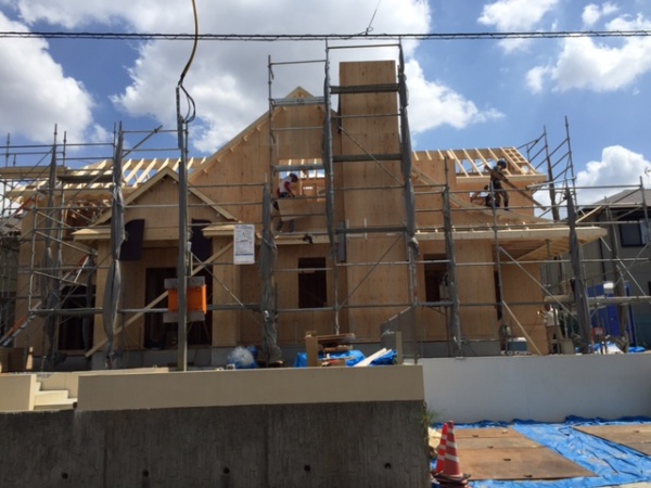 鳥栖のM邸上棟しました。フレーマーたちのきびきびした動きと、精度、礼儀・・・・申し分ありません。すぐK建設の社長に、電話をして、「いいですねー。」と伝えると、ありがとうございます。工事の者も喜びますが、まだ終わったわけではないので、完工してから」とおっしゃってました。教育ができてる会社です。建物のプロポーションはバランスがよく、見え方も思い通りです。手前味噌ですが、かっこいい建物になるでしょう。仕上げのテクスチャーと色を間違わなければ「美しい家」です。外構についても家の形ができると見えてきました。予定してたガレージハウスは再考します。本格輸入住宅と呼べる建物です。オーナーご夫婦の信頼にこたえられるように、工事を進めます。今日も夕方現場でお会いして、タイルや、電気についお話します。