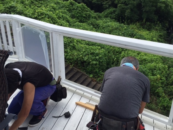 昨日は武雄、鹿島。北九州と走り回り、打ち合わせでした。今日夕方までに、ワッセナーの改装増築案は図面を完成させました。午前中は香椎のU邸デッキ工事のアクリル板手すり取り付け工事です。手すりがないほどの透明度で、より福岡の街が見下ろせます。佐世保から朝早く駆けつけてくれたアーツ工房に感謝です。天気や、メーカー都合、いろいろな弊害を乗り越えて真っ白い透明感たっぷりのデッキが完成します。夏を楽しむための工事です。花火とビールとBBQ・・・・・・最高