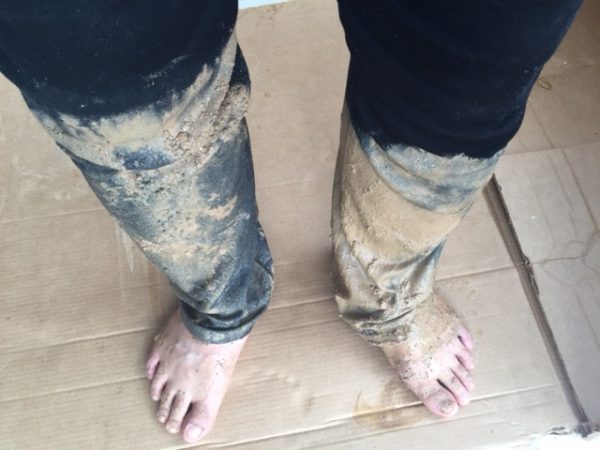鳥栖M邸が竣工検査と、取扱説明でした。半年以上かけて、作り上げてきた家は、いつものことですが、喜びと反省と、うれしさとさみしさと複雑です。工業化住宅や、既製品の組み合わせの家づくりと違い、手作りです。重箱の隅をつつくような検査は必要ありません。手作りで味わい深く、バランスがいい空間かどうかです。近づいてみる検査より、遠く離れて全体を見ることがデザインの検査です。雨の中荷物を入れる手伝いの最中、配管のため、掘って埋め戻したところに足を置き、写真のような有様です。みんなから笑われました。これから我々からオーナーに家づくりの責任者が変わります。どう素敵に育てていただけるか楽しみです。9日お引越しです。落ち着いたらまた写真撮影を行います。