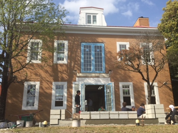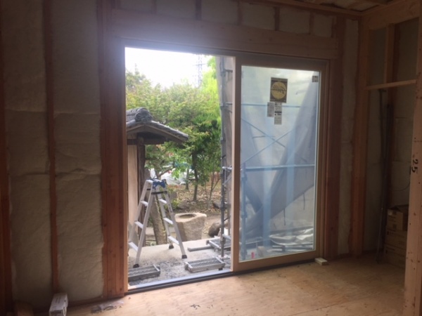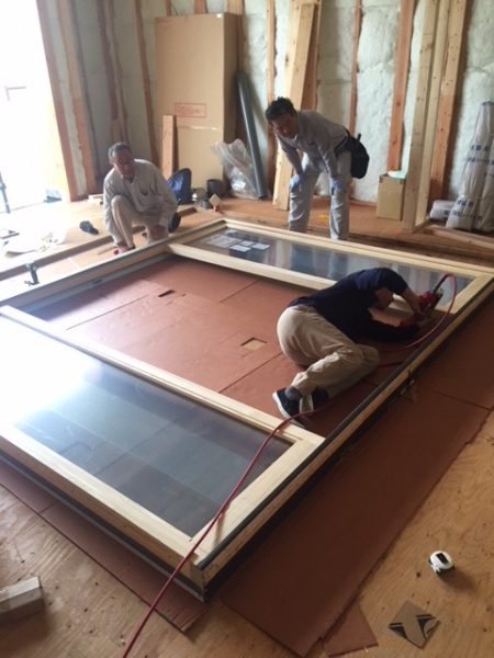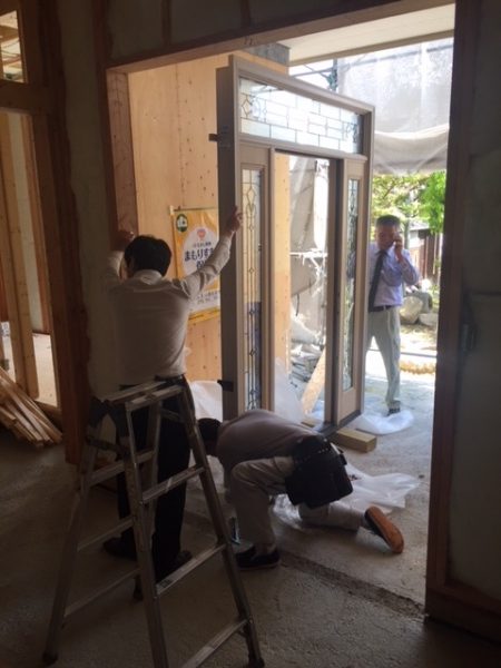 K邸に大型木製サッシが2箇所と玄関ドアが現場搬入され、組み立て取り付けでした。圧倒的な存在感です。広縁などは大人4,5人で抱える重さです。空間全体がしまります。家のデザインは生活、外観、空間、インテリアをトータルでバランスよく作ることです。オーナーであれ、ひとつ二つにしか目が行かない人がとやかくいうとひどい家になります。大工や、職人、サッシ業者、工務店社長・・・・みんなが手伝い取り付け後、笑顔で満足できる存在感です。いつも現場では職人さんに感謝です。東京からわざわざ来てくれた人や、空調屋も駆けつけてくれました。みんなで作り上げるものです。