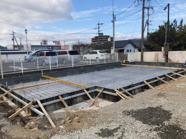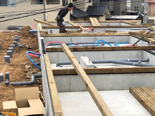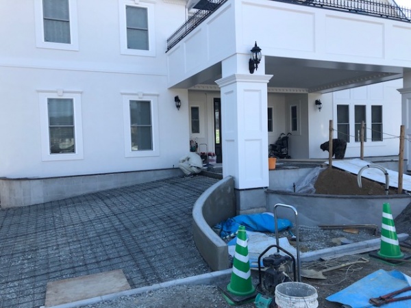 南区のA邸のフレーミング開始です。毎日朝30分ほど現場に行きますが、「なんとしてでも間に合わせる。」という棟梁の気持ちが表に出て、若い人を引き連れがんばっています。マグサのかけ方や、合板の種類、コラム柱・・・・いくらか頭をひねるところは話し合い、とにかく前に進んでいます。輸入部材の担当者や、実施設計担当者、など多くの人の目でチェックしながら工事を進めるつもりです。佐賀県のY邸は外構工事と、ガレージ基礎工事を行っています。とにかく打ち合わせを密に行い、敷地全体がデザインされていなければいけません。今日、エントランススロープのスタンプコンクリート打設です。どの現場も年始から全力です。